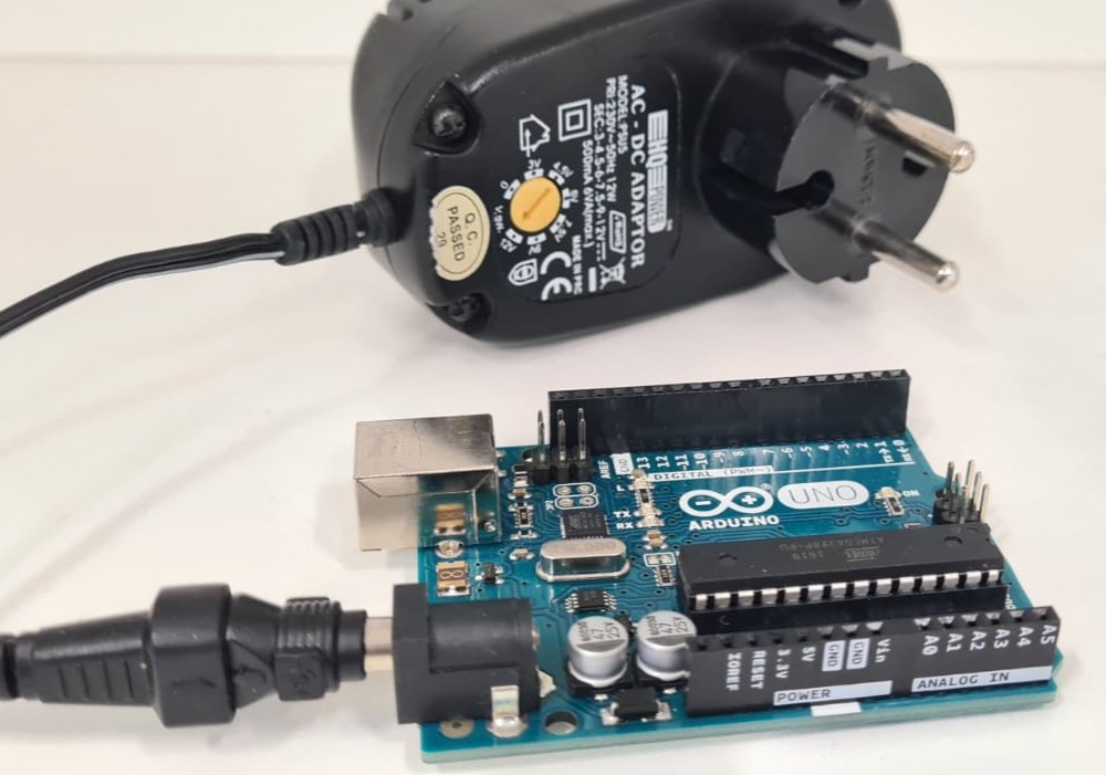 Steek de voedingskabel in de powerpoort van het Arduino Uno-bord. Zorg ervoor dat de DC-voeding is ingesteld tussen 7 en 12 volt.