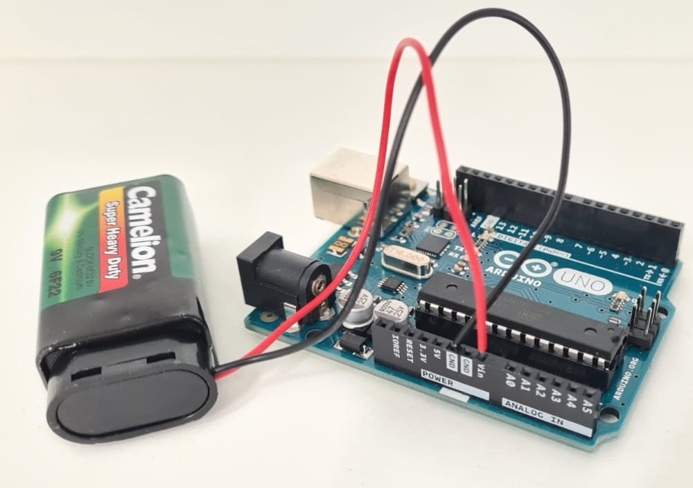 Verbind de pluszijde van een 9V-batterij met de VIN-pin, en de minzijde met de GND-pin.