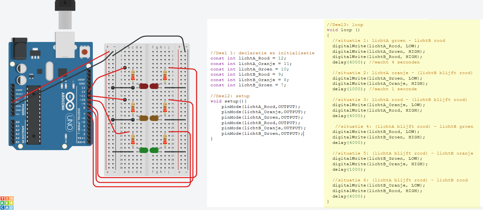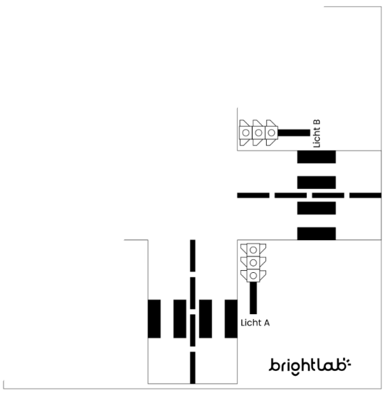 Programmeer verkeerslichten A en B van volgend kruispunt. Afwisselend worden ze groen - oranje - rood. Maak een schakeling met 6 leds en 6 weerstaanden.