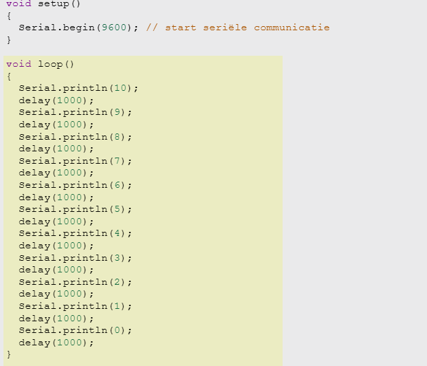 Laat je Arduino herhalend aftellen van 10 naar 0, geef dit weer in de serial monitor. Maak en nieuwe sketch en schrijf je code.