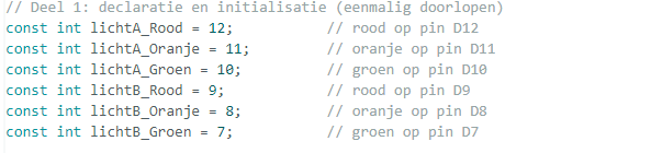 Maak 6 constante variabelen met de pinnummers waar de leds aan vasthangen.