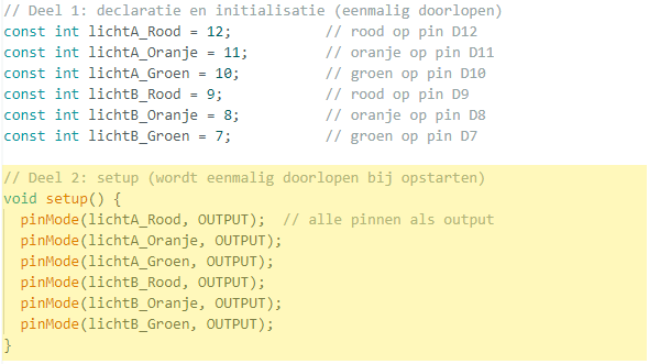 Uit bovenstaand stroomschema wordt duidelijk dat je 6 situaties kan onderscheiden waarbij verschillende lichten samen branden. Deze code gebruikt dezelfde functies die we reeds zagen in het Blink programma. Schrijf de code uit en test ze voor situatie 1 en 2. Breid daarna verder uit.