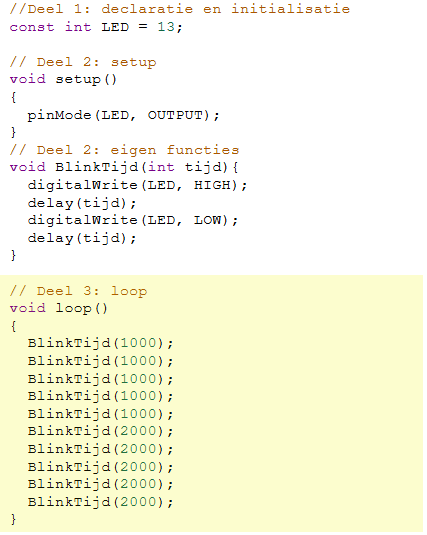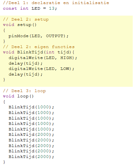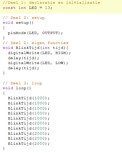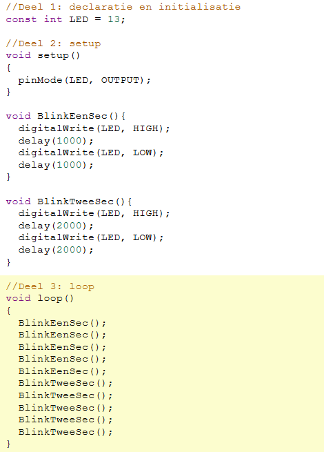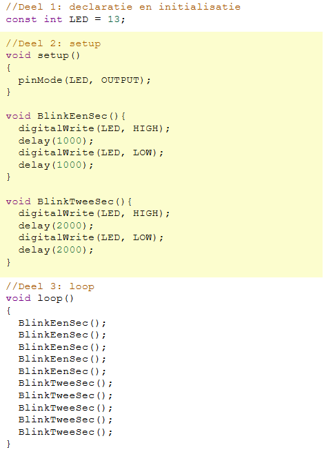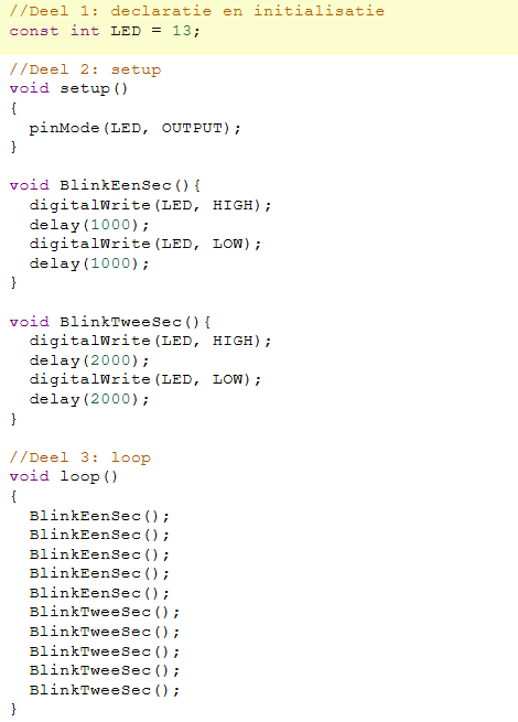 De code voor de functie blinkEenSec() en de functie blinkTweeSec() zijn bijna gelijk. Enkel de tijd die in de delay() functie wordt meegegeven is anders.