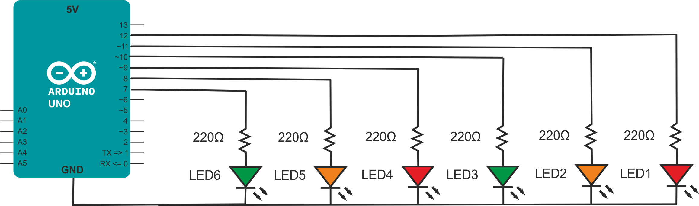 Deze oefening is gebaseerd op een voorbeeld van Arduino. Wil je de volledige oefening proberen, breidt dan uit naar 6 leds en implementeer een tweede for-lus in het loop gedeelte waarbij alle leds één voor één weer uit gaan.