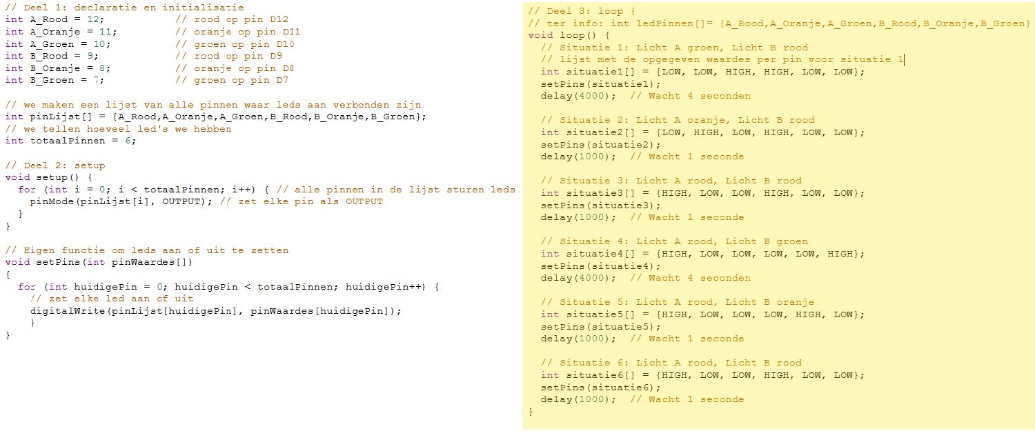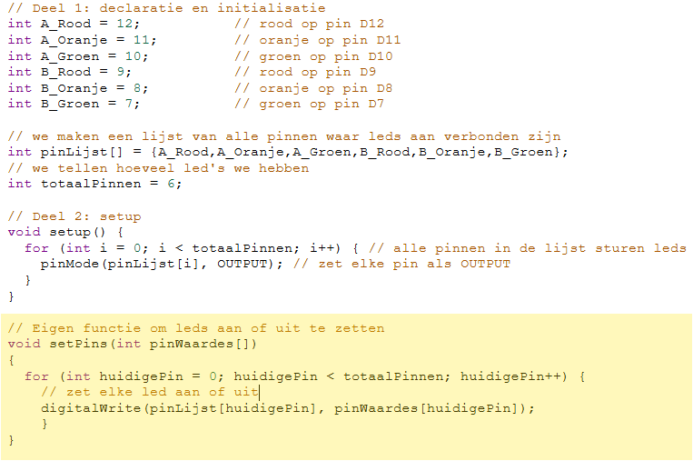 De functie digitalwrite(pin, waarde) wordt bepaald door twee parameters namelijk pin en waarde. Deze worden meegegeven door de lijst pinLijst[] en door de lijst pinWaardes[].